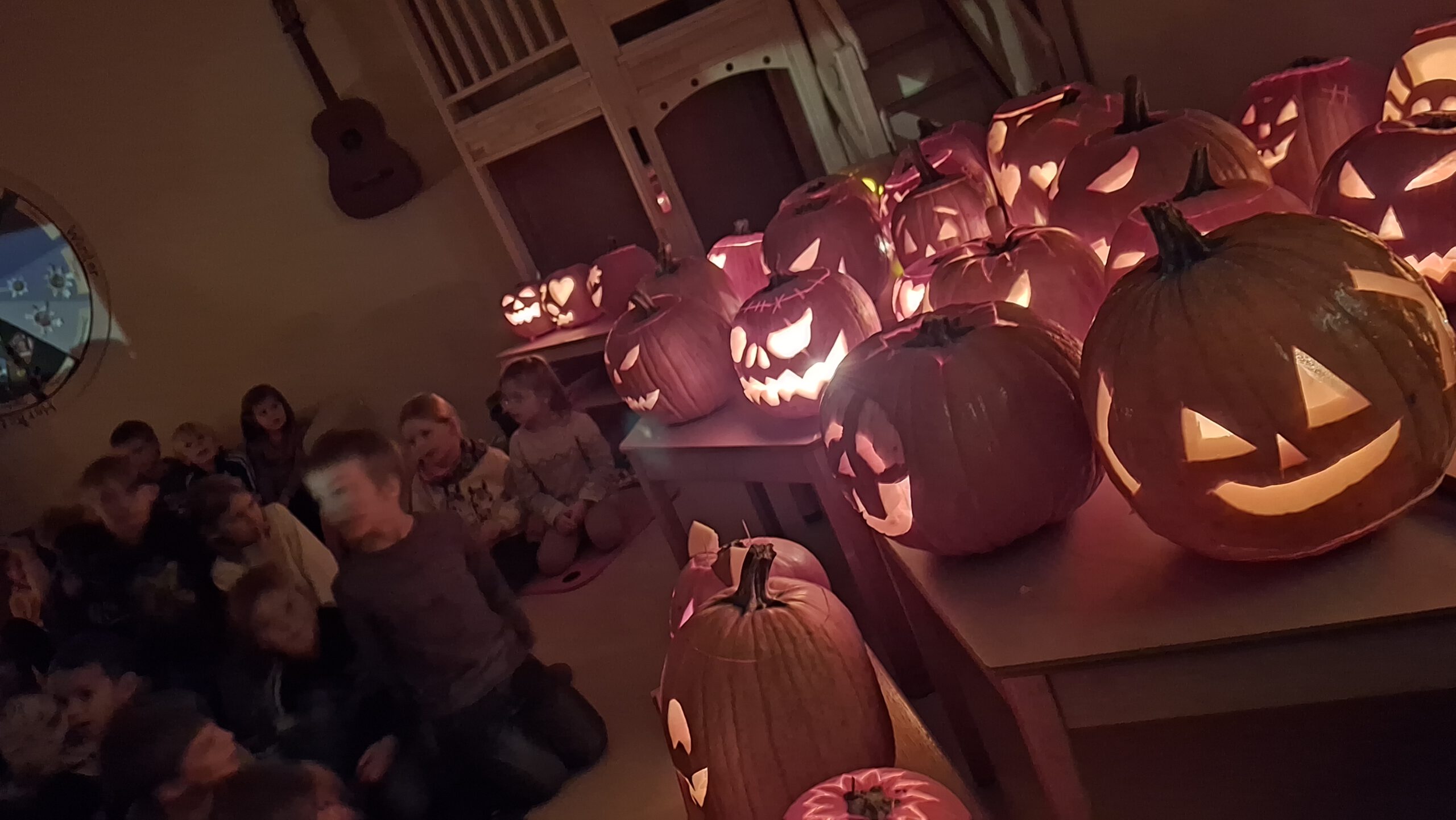 Nach einer wärmenden Portion Kürbissuppe lauschten die Kinder einer kleinen Halloweengeschichte. Zum Abschluss wurden die kunstvollen Kürbisse feierlich erleuchtet und sorgten für eine stimmungsvolle Atmosphäre.